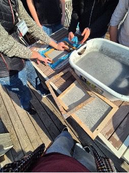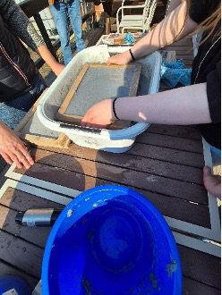 Melena schöpft mithilfe eines Rahmens etwas Pulpe, um daraus ein Blatt herzustellen.
