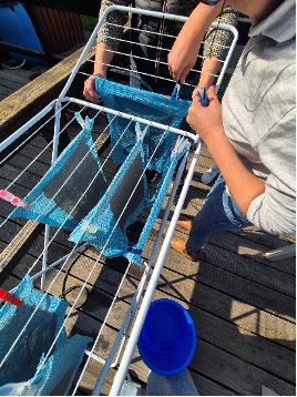 Die geschöpften Blätter hängen zum Trocknen am Wäscheständer.